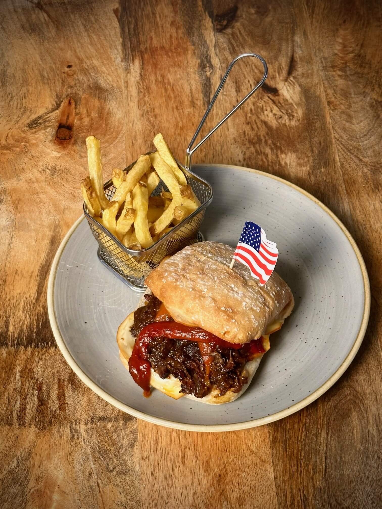 Sí, como lo oyes. Hemos cogido una receta castiza, de las de abuela y chup-chup eterno, le hemos metido humo durante horas en nuestro ahumador americano y luego lo hemos convertido en una bomba carnívora que va directa al corazón del barrio. Jugoso, meloso, intenso… esto no es una hamburguesa, es una declaración de amor a Madrid y al BBQ.